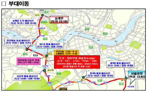 군 병력 수송 버스와 K2전차 등 기갑 장비부대가 이동하는 오후 1시 40분부터 오후 3시 20분까지 서울공항을 시작으로 헌릉로∼양재대로∼동작대로∼현충로∼한강대로에 이르는 진행 방향 전 차로를 통제한다. 기갑 장비부대 이동구간은 일반 차량과 노선버스 진입을 차단하고 이 구간 노선버스는 가장 가까운 지하철역까지 운행한 뒤 회차할 예정이다.