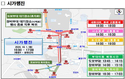 도심을 지나는 차량은 남대문로(종로1가∼을지로입구∼한국은행∼숭례문)와 통일로(서대문∼의주) 방향으로 돌아가도록 안내할 예정이며 서소문로(경찰청∼시청)의 경우 시가행진이 마무리되는 오후 4시 30분께부터 차량을 소통시킬 계획이다.