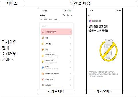 ○ 카카오페이는 카카오페이앱을 통해 고객정보와 연계하여 한 번의 클릭으로 전화권유판매 수신거부(두낫콜) 등록 및 철회·수정 기능을 제공한다.