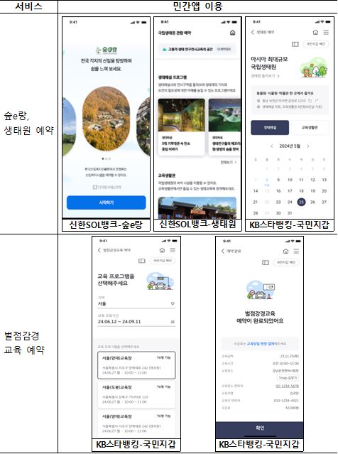 ○ 신한은행은 SOL뱅크앱을 통해 산림청 숲e랑과 국립생태원 예약을, 신한카드는 SOL페이앱에서 분실물 신고 및 조회 서비스를 편리하게 이용할 수 있도록 제공한다.