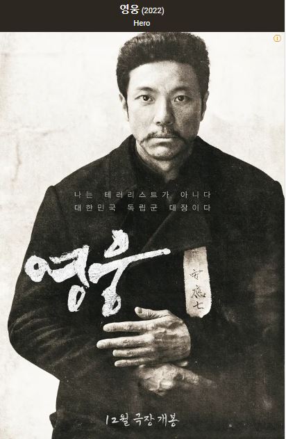 "영웅"은 대한민국에서 제작된 윤제균 감독의 2022년 뮤지컬 영화로는 정성화, 김고은, 나문희가 출연한다. 뮤지컬 영웅을 원작으로 한 이 영화는 1909년 초대 일본 총리이자 조선 통감이었던 이토 히로부미를 암살한 대한민국의 독립운동가 안중근 의사의 마지막 1년을 다룬다.