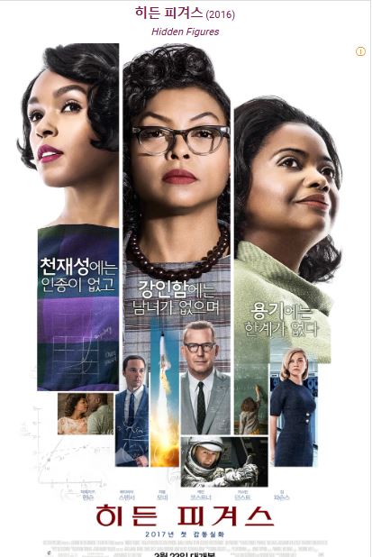 "히든피겨스"는 제89회 아카데미 시상식 작품상, 각색상, 여우조연상 후보작으로 1962년 머큐리 계획이 있을 당시 나사의 우주 임무 그룹에서 일했던 실화를 바탕으로 쓴 마고 리 셰털리의 책 《히든 피겨스: 미국의 우주 경쟁을 승리로 이끈, 천재 흑인 여성 수학자 이야기》를 바탕으로 만든 영화이다. 이제는 전자 컴퓨터의 발달로 생소한, 인간 컴퓨터인 계산원 흑인 여성들의 이야기를 다루고 있다.