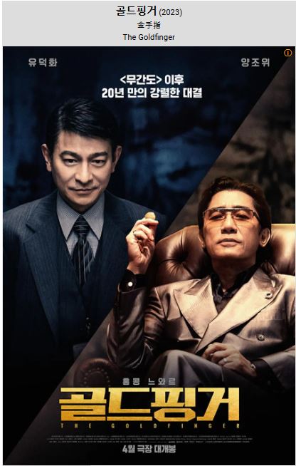 "골드핑거"는 홍콩의 2023년 범죄 영화로 한국에서는 2024년 4월에 개봉했다. 감독은 2018년에 개봉한 '무쌍'을 연출한 장문강이고, 양조위, 유덕화 등이 출연했다.