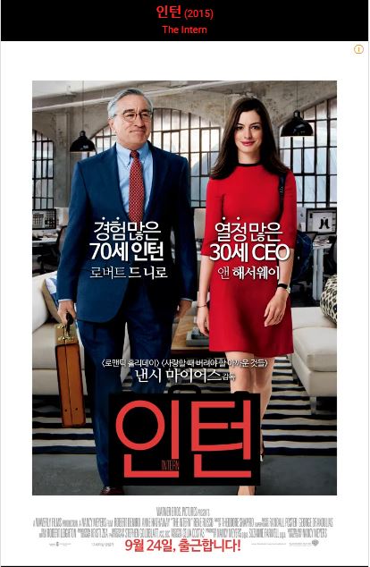 "인턴"은 낸시 메이어스가 각본과 감독을 맡은 2015년 코미디 드라마 영화로 이 이야기는 70세의 홀아비 벤 휘태커(로버트 드니로 분)가 은퇴가 전부가 아니라는 사실을 깨닫는 과정을 다룬다.