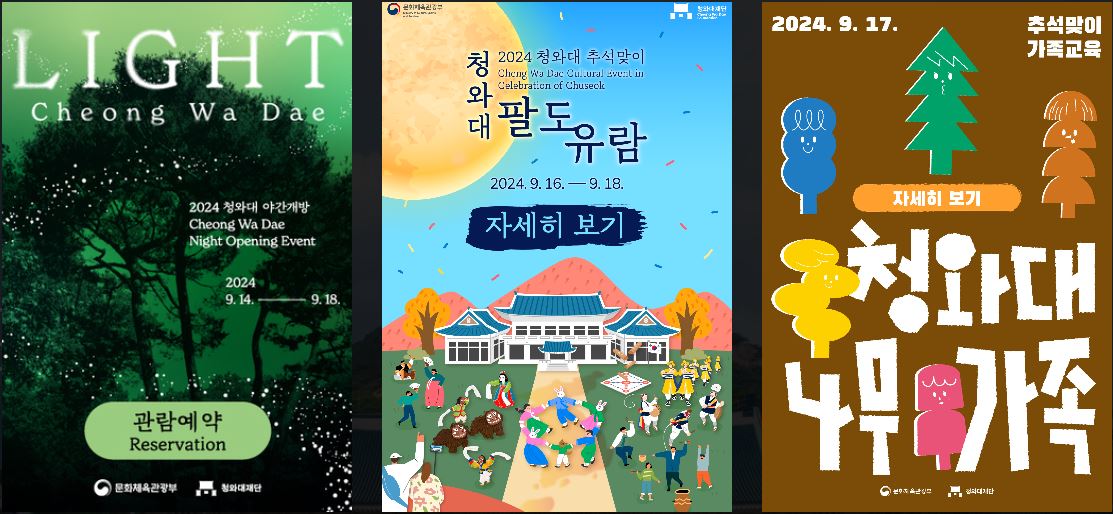 청와대에서는 연휴 기간 가을밤 산책을 만끽할 수 있도록 야간 무료 개방이 실시된다. 청와대는 9월 14일 ~ 9월 18일 오후 7시 30분부터 9시 30분까지 무료로 관람할 수 있다. 재즈가 흐르는 청와대의 밤과 가을밤의 산책 등 문화 행사가 진행된다. 9월 16일 ~ 9월 18일에는 청와대 헬기장과 춘추관 등에서 온 가족이 즐길 수 있는 길놀이 행진, 팔도 민속놀이 체험 등 주간 문화행사도 열릴 예정이다.