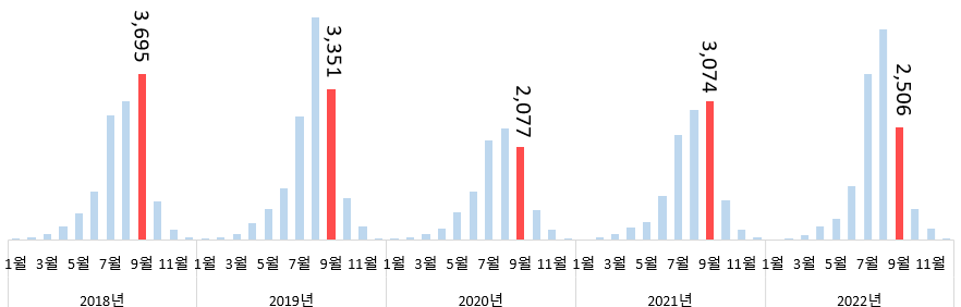 최근 5년(’18~’22년)간 9월에 벌에 쏘여 병원진료를 받은 환자는 총 14,703명이며, 이 중 372명은 증세가 심하여 입원 치료를 받았다.