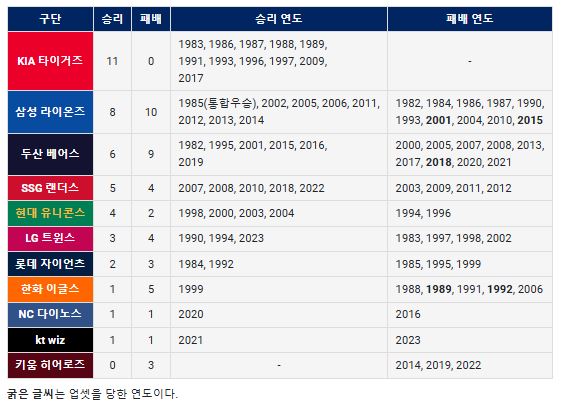 팀별 우승 횟수